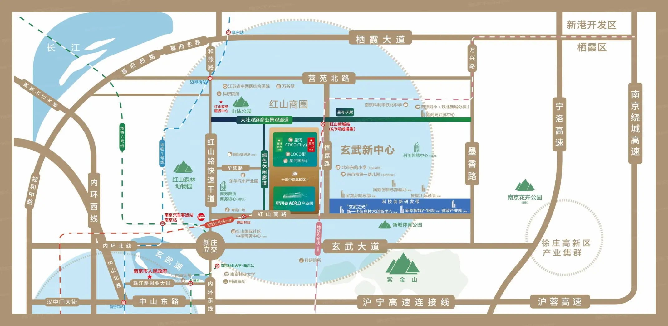 南京星河中心,南京星河世界新出高端商务写字楼,位于玄武区领智路18号,地铁6、9号线换乘站红山新城站地铁上盖,预计2024年10月底交房,南京星河中心总建面约2.3万㎡,地下2层,地上20层。1-4层为购物中心(星河COCOCITY),5-20层为可售商务办公...