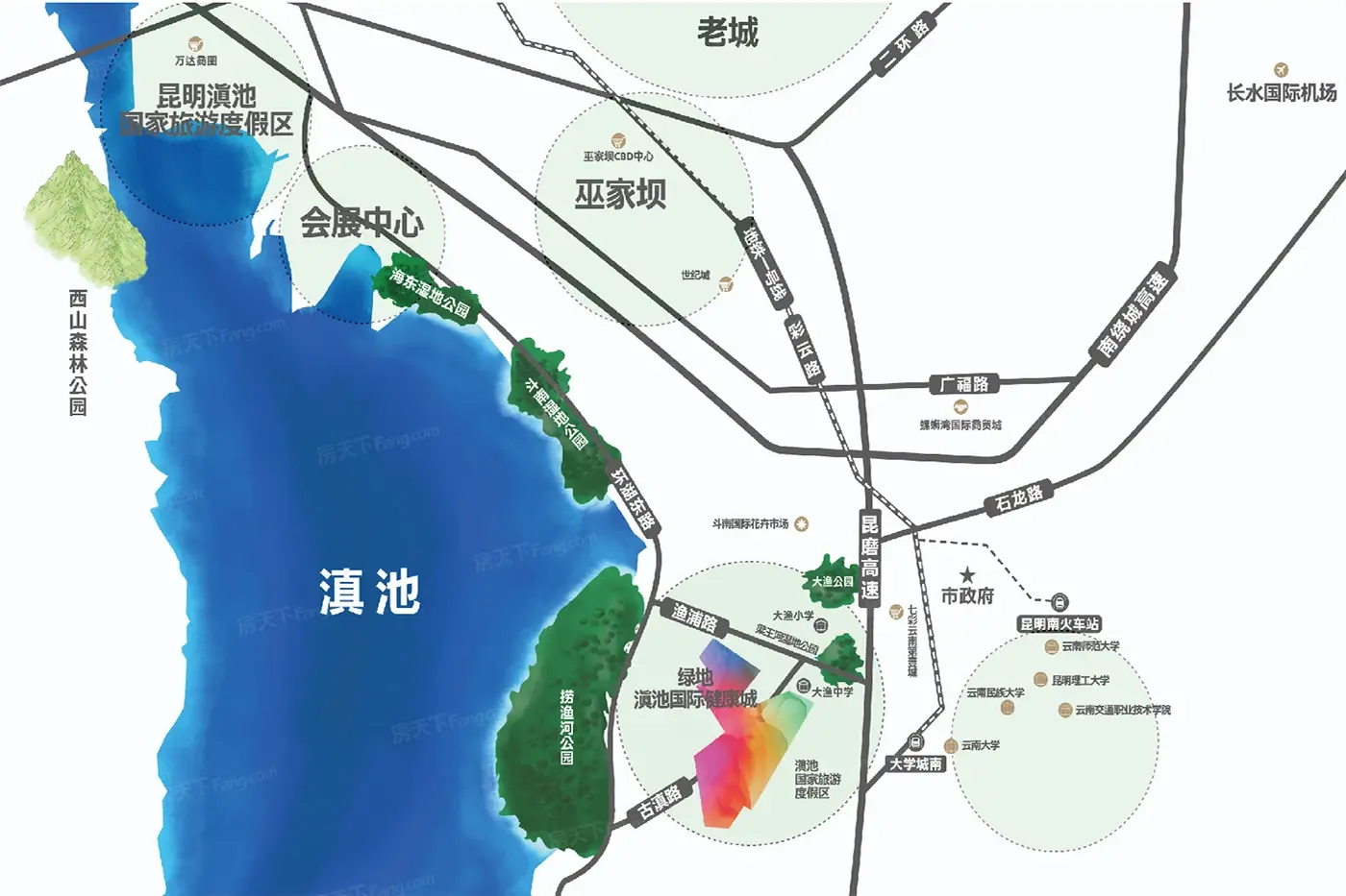 绿地滇池国际健康城主推洋房,有毛坯房也有精装房。建面约69-128㎡,毛坯洋房均价12000元/㎡,精装洋房均价13500元/㎡。