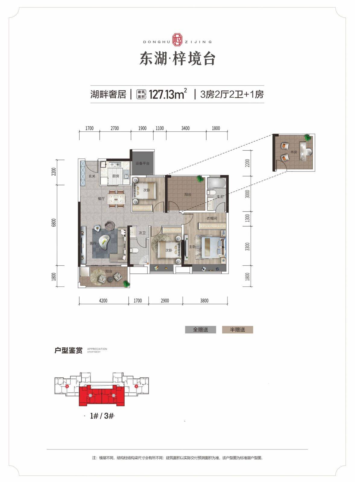 东湖·梓境台1-3#在售少量建面127平、142平、188平毛坯现房住宅,均价10700-12500元/平.